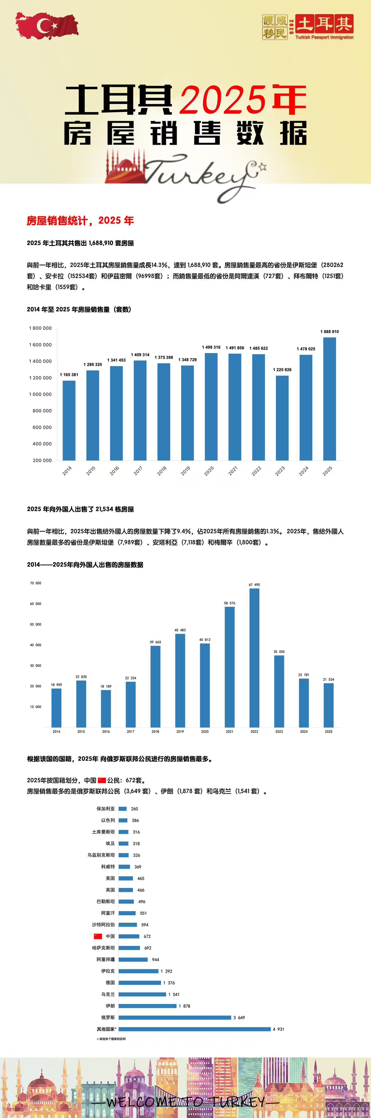 2025年土耳其房屋销售统计:俄罗斯3649套,德国1376套,中国672套,美国466套,英国465套,由此可见,市场上房产的接受度还是最高的。